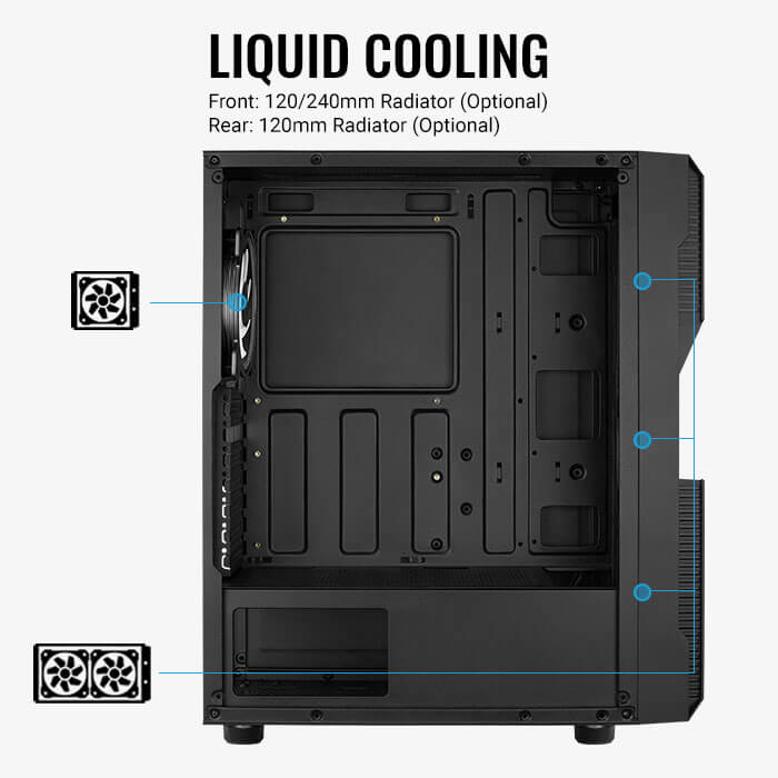 Вентилятор 120 мм на передней панели, 1 x 120 мм ARGB на задней панели |