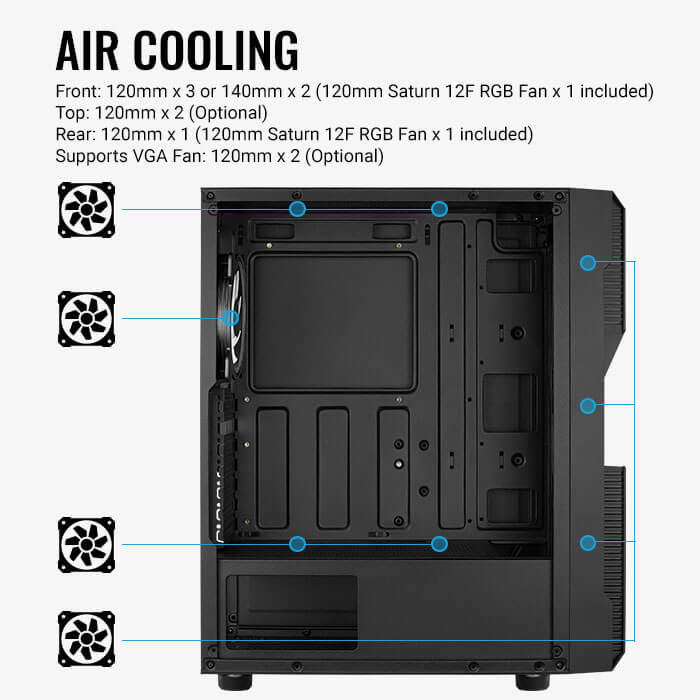 Корпус формата mid-tower для высокопроизводительных ПК; передняя панель с сетчатой решёткой улучшает вентиляцию компонентов. Передняя панель с отделкой под углеволокно придает вашему игровому ПК футуристический внешний вид. Боковая панель из закалённого стекла позволяет рассмотреть все компоненты системы. В комплекте поставки вентилятор Saturn 12F RGB со статичной RGB-подсветкой.