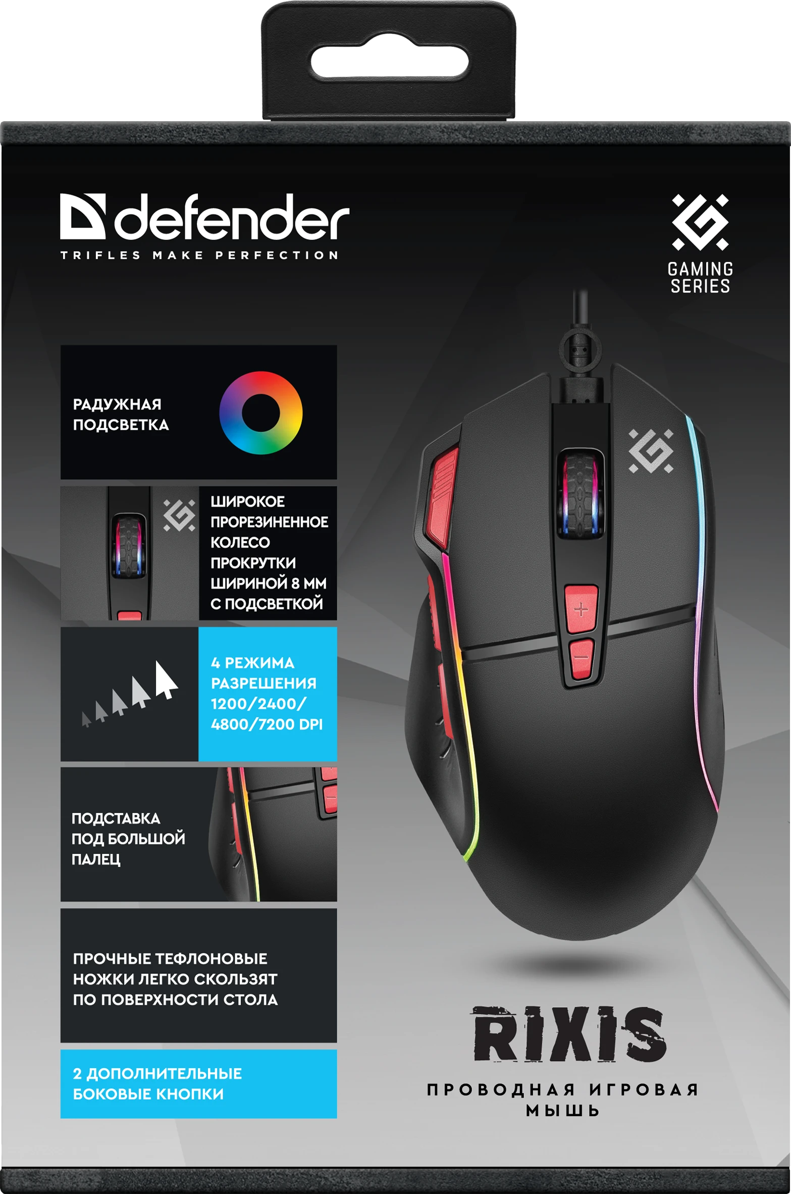 Проводная игровая мышь с радужной подсветкой и кнопкой Fire для шутеров. Мышка имеет эргономичную форму с подставкой для большого пальца. Также данная модель имеет 2 боковые кнопки, удобное широкое прорезиненное колесо прокрутки и тефлоновые ножки для легкого скольжения по любой поверхности.