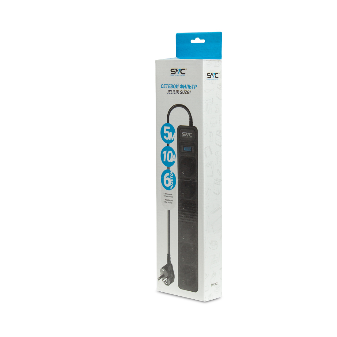 SVC ZC6S-50M — это классический сетевой фильтр на 6 розеток с длинным кабелем, предназначенный для защиты домашней и офисной техники от перепадов напряжения и короткого замыкания.